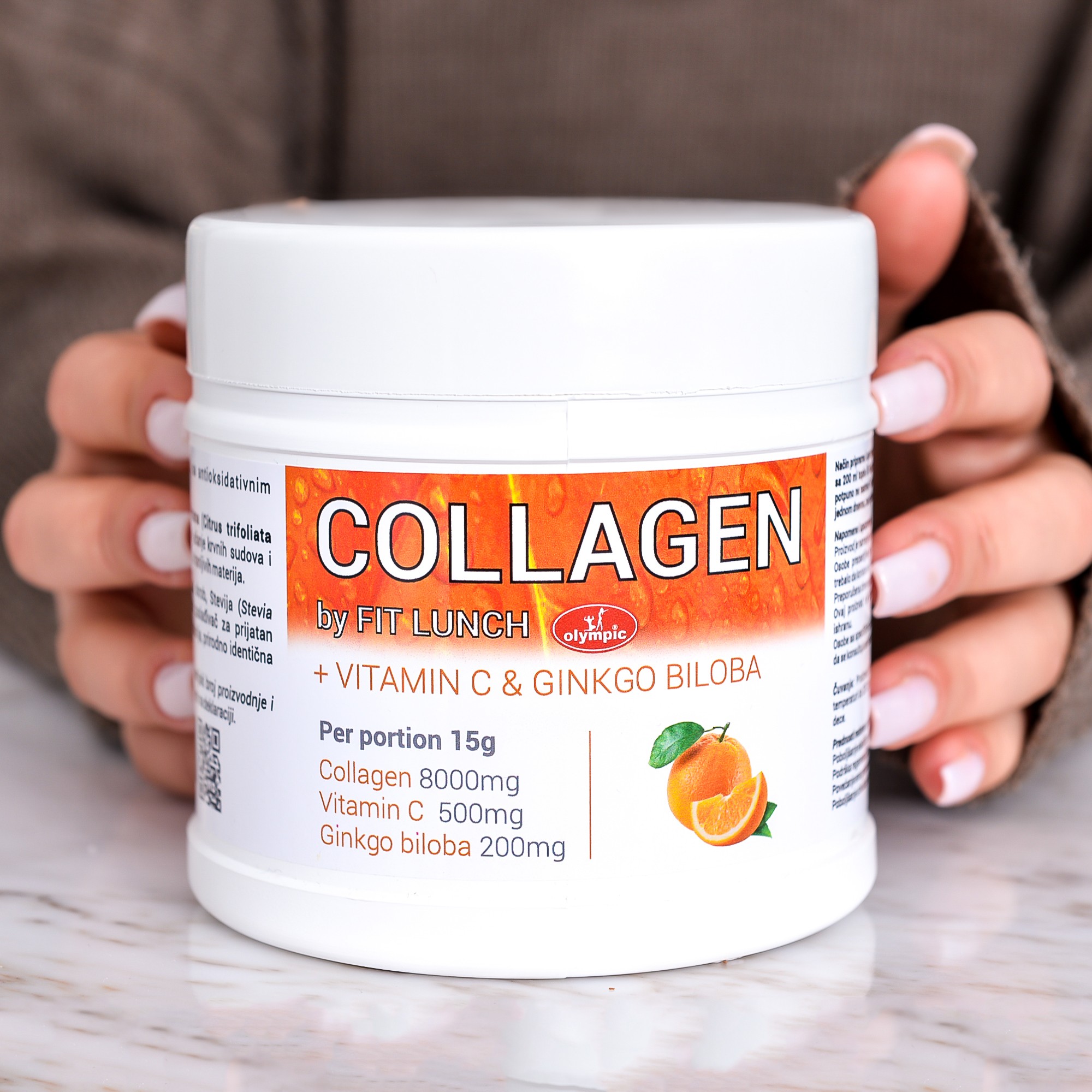 Jedna porcija sadrži 8000 mg kolagena i 500 mg vitamina C.