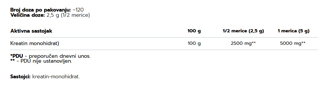 Rastvoriti 1 porciju proizvoda 2,5 g (1/2 merice) u 100-150 ml vode ili soka u šejkeru. U zavisnosti od vaših potreba, konzumirati 1-2 porcije dnevno. U danima treninga konzumirati prvu porciju ujutro nakon ustajanja i drugu porciju nakon treninga. U danima bez treninga konzumirati jednu porciju ujutro nakon ustajanja.